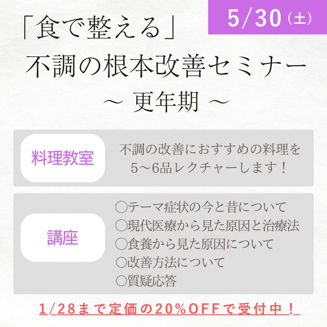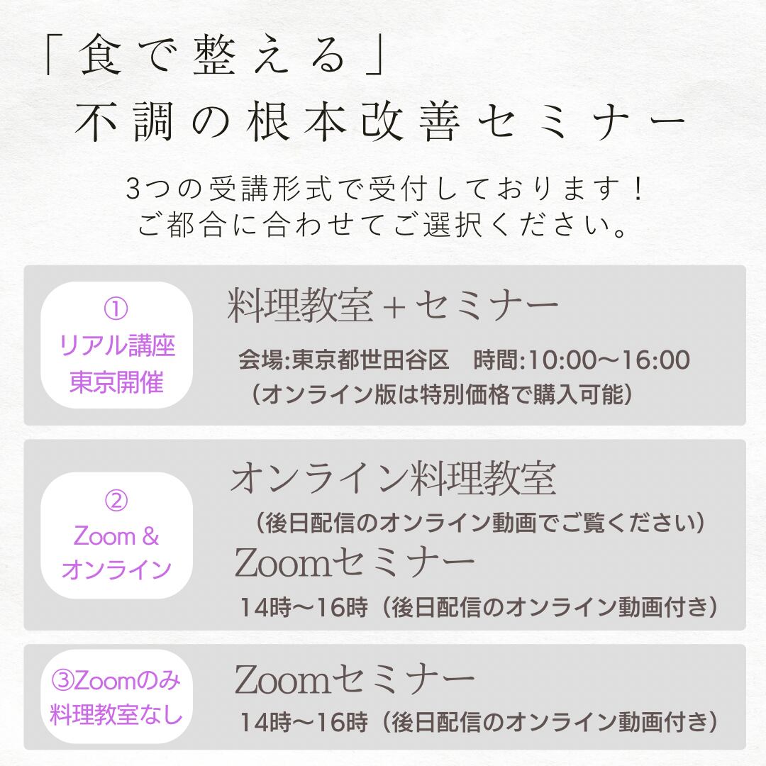 不調別に料理・お手当・座学を1つにまとめたセミナーになります。